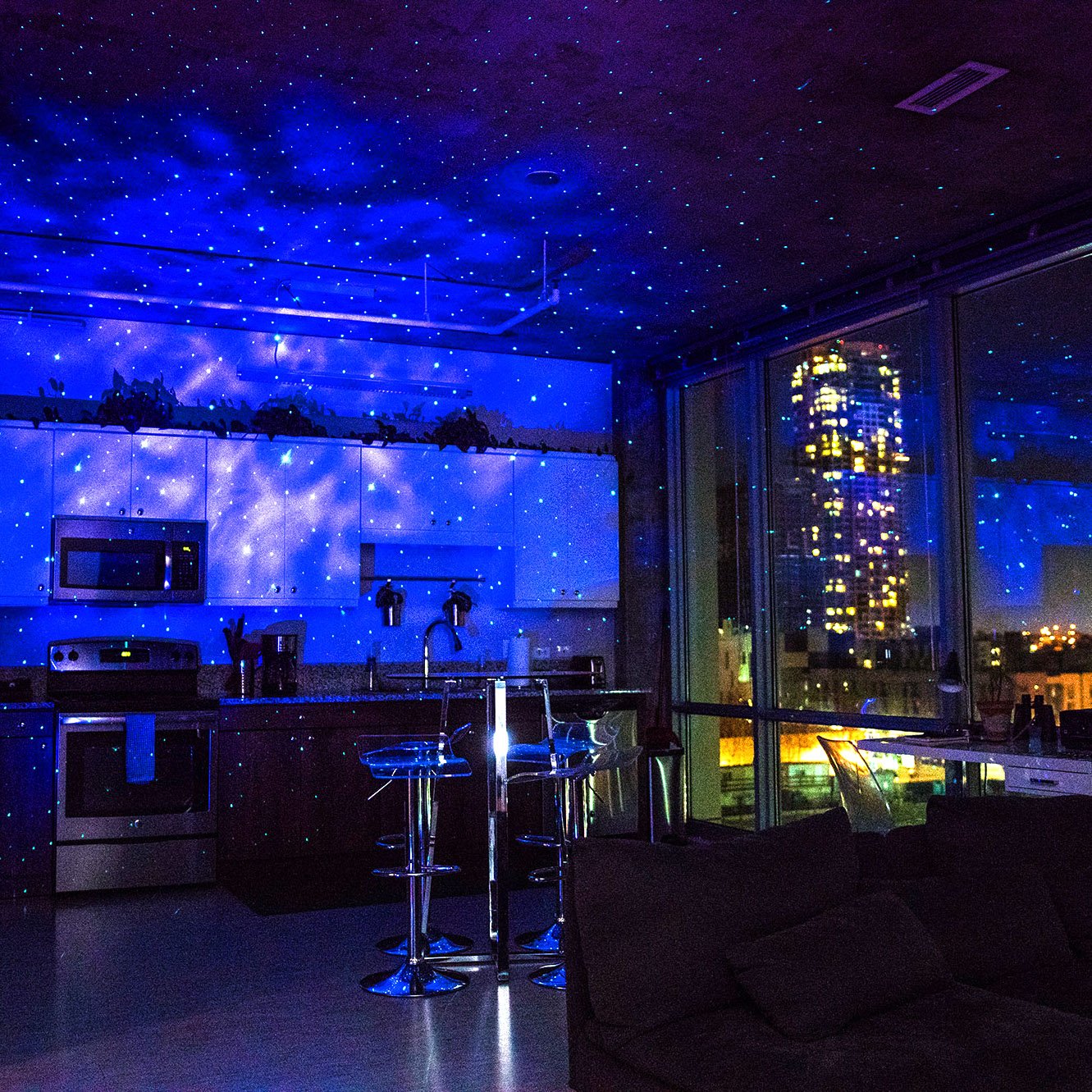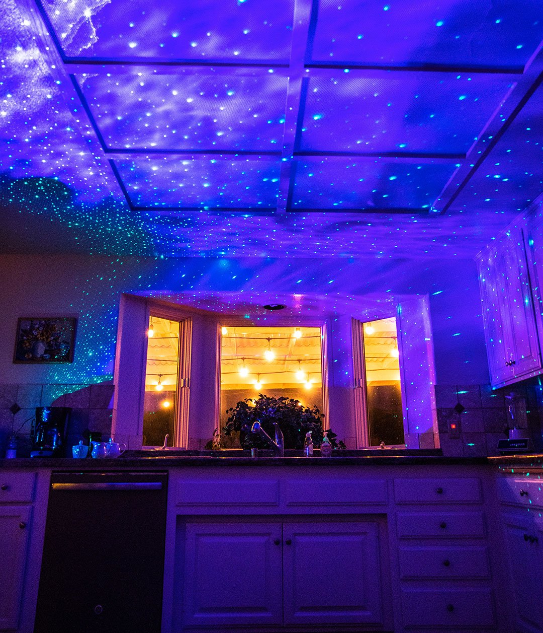 Shine a universe of moving laser stars against a drifting blue nebula cloud. Tilting design allows you to shine the effect on walls or ceiling. Includes built-in 6hr auto shut off and USB power cord with adapter.